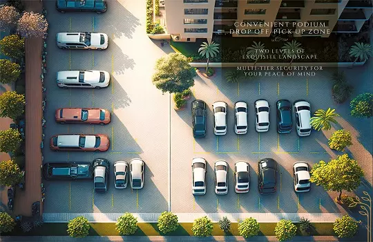 Residents enjoy world-class facilities including a 40,000 sq. ft. clubhouse, triple-height grand entrance lobbies, rooftop sky lounges, destination-controlled private lifts, and a vehicle-free green podium. The project also features 70% open green spaces and IGBC Green Home ratings.