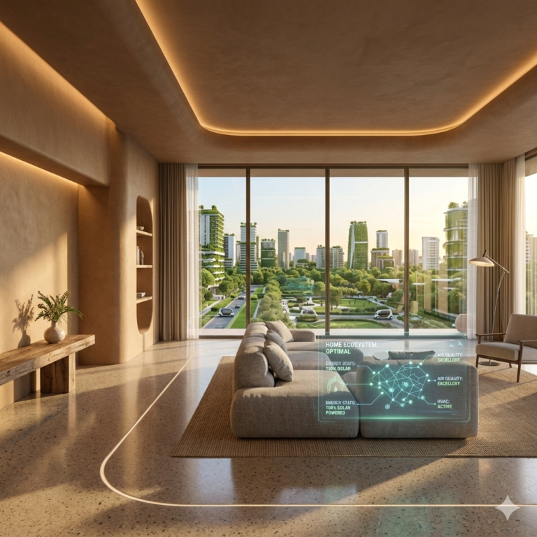Sustainability is no longer optional. Future smart homes will act as micro-power plants. Through Vehicle-to-Home (V2H) technology, your electric vehicle (EV) will not just draw power from the house; it will feed power back during peak hours. Advanced AI will manage the “smart grid,” selling excess solar energy back to the city, making the future of home automation a financially self-sustaining venture.